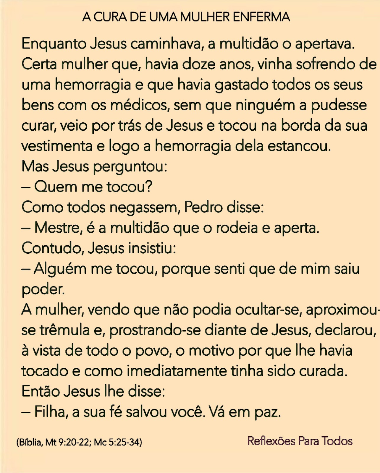 Certa mulher que, havia doze anos, vinha sofrendo de uma hemorragia e que havia gastado todos os seus bens com os médicos, sem que ninguém a pudesse curar, veio por trás de Jesus e tocou na borda da sua vestimenta e logo a hemorragia dela estancou.