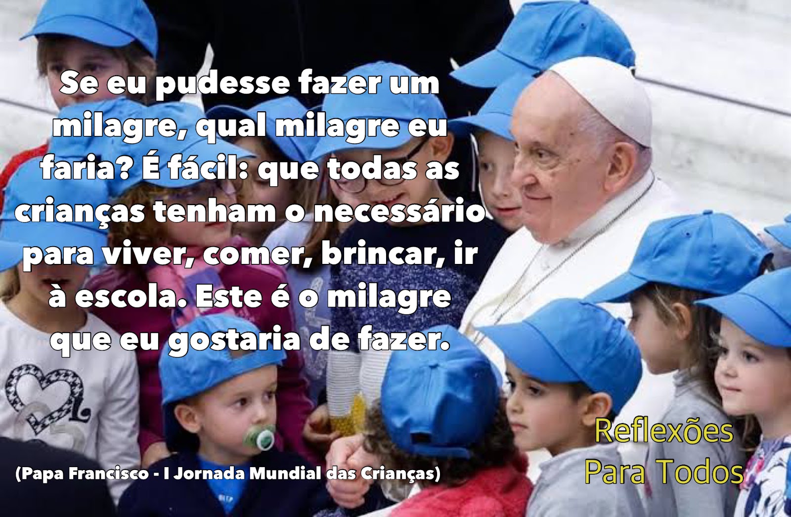 “Se eu pudesse fazer um milagre, qual milagre eu faria? É fácil: que todas as crianças tenham o necessário para viver, comer, brincar, ir à escola. Este é o milagre que eu gostaria de fazer”, disse Francisco, ao responder a pergunta de uma criança da Indonésia, no âmbito da I Jornada Mundial das Crianças realizada no Estádio Olímpico de Roma.