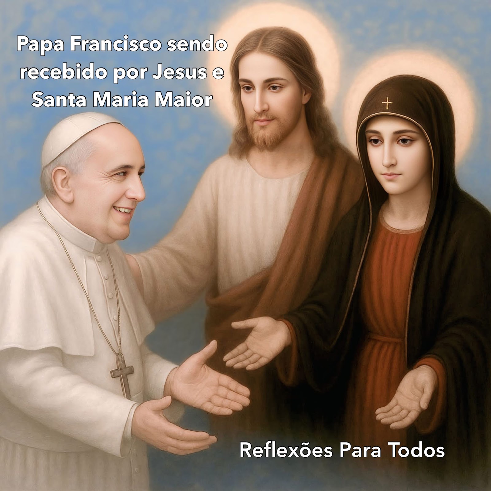 Chegada do Papa Francisco ao Céu, sendo recebido por Jesus e e pela Virgem Maria, na imagem que consta na Basílica de Santa Maria Maior, onde foi sepultado (crônica fictícia).