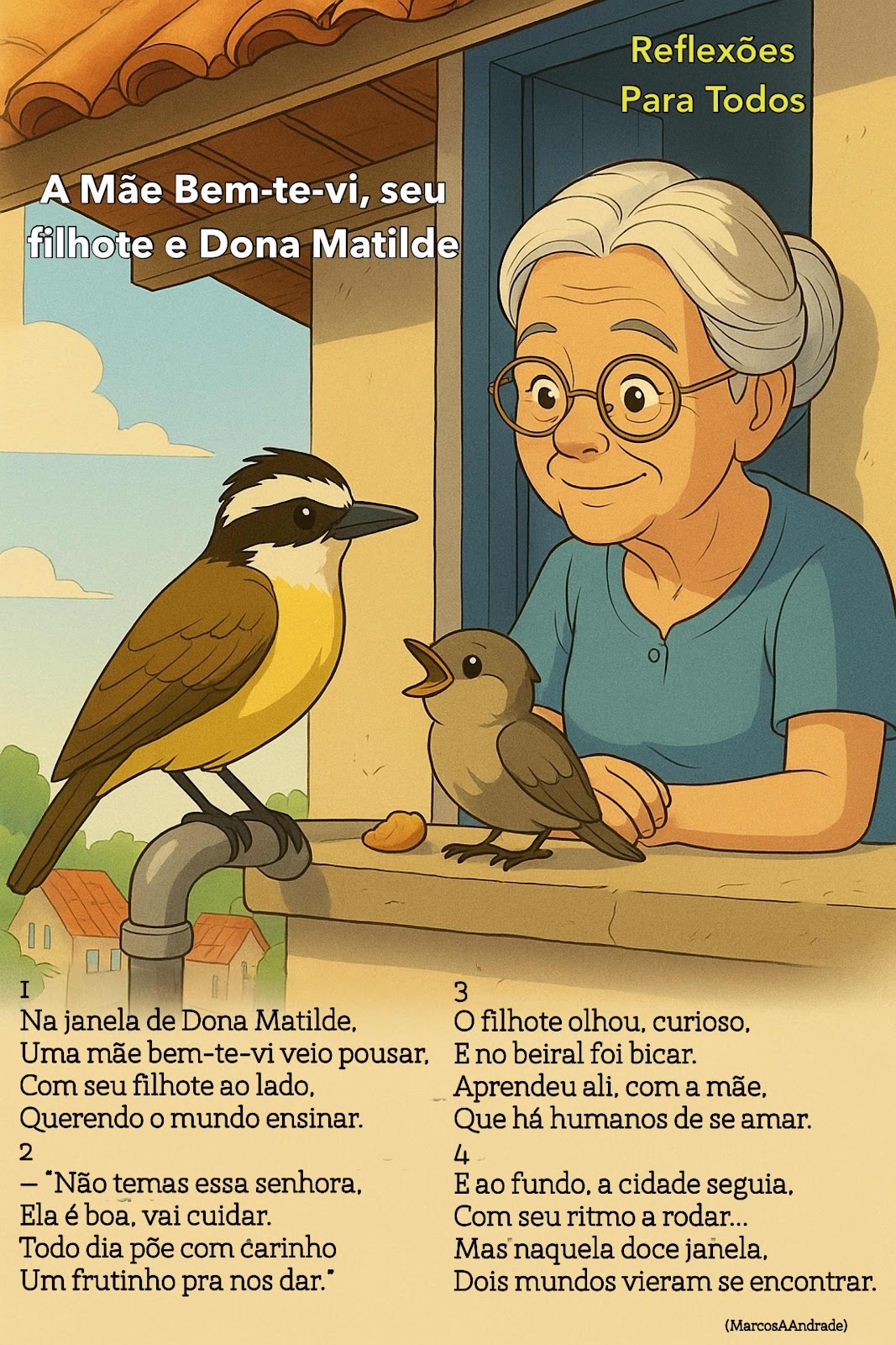 Era como se o tempo tivesse parado por um instante para assistir àquela cena de confiança e gratidão. A mãe bem-te-vi deu mais um canto suave e, juntos, os dois alçaram voo, deixando Dona Matilde com o coração aquecido.